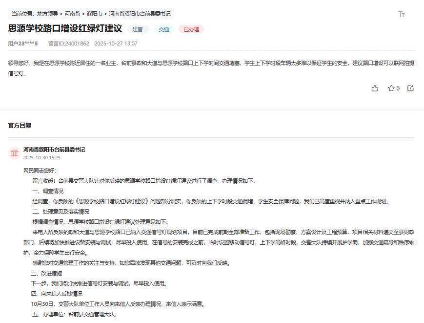 “你反映的问题,我们已高度重视并纳入重点工作规划。”台前县交通管理大队接到留言后,对问题进行了调查。群众所反映的政和大道与思源学校路口已纳入交通信号灯规划项目,目前已完成前期全部准备工作,包括现场勘察、方案设计及工程预算,项目相关材料已递交至县财政部门,后续将加快推进设备安装与调试,尽早投入使用。