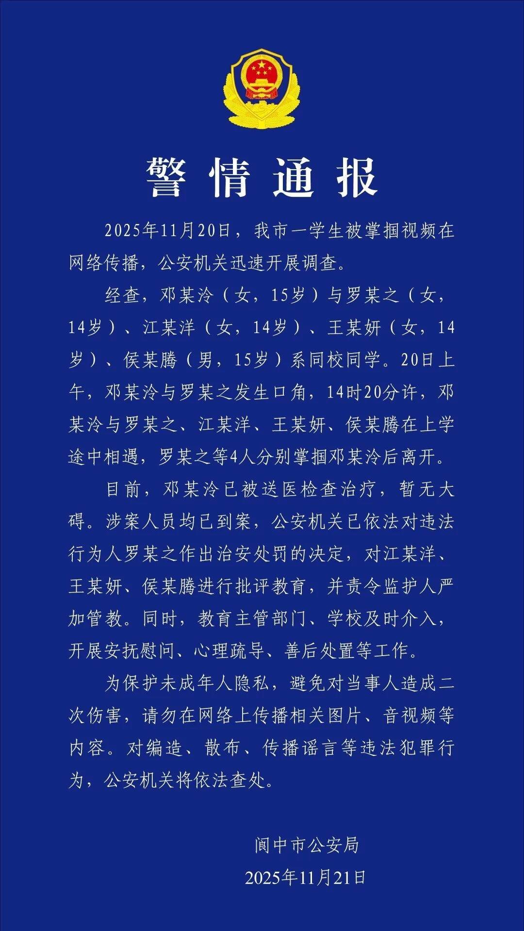 2025年11月20日,我市一学生被掌掴视频在网络传播,公安机关迅速开展调查。